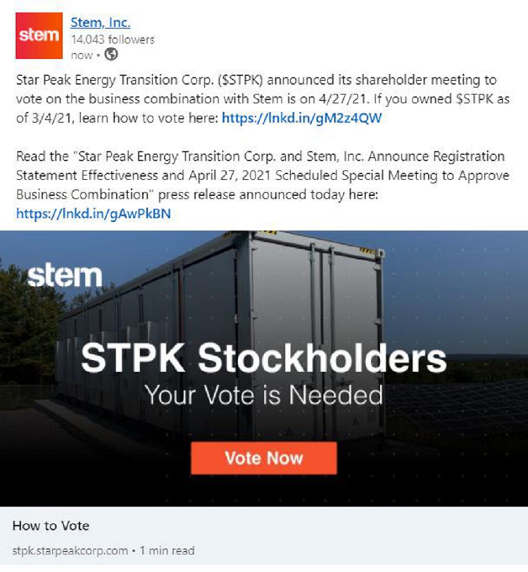 The following communication was made available by Stem, Inc. on LinkedIn on March 29, 2021: