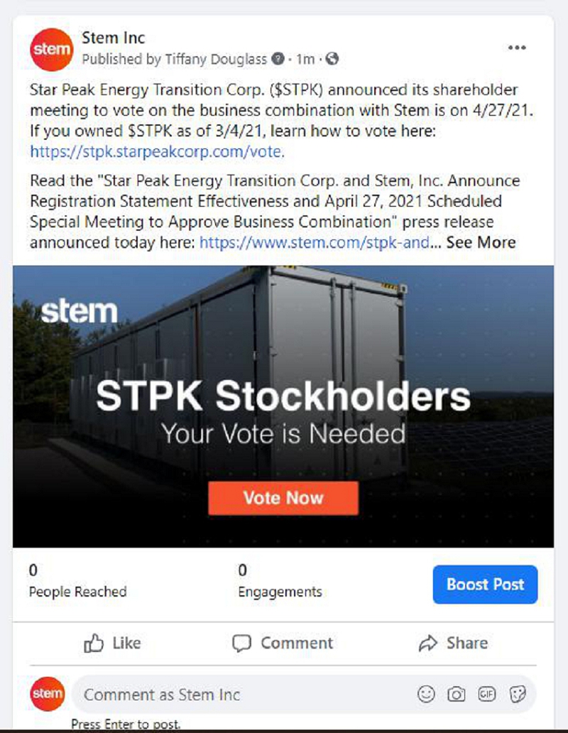 The following communication was made available by Stem, Inc. on Facebook on March 29, 2021: