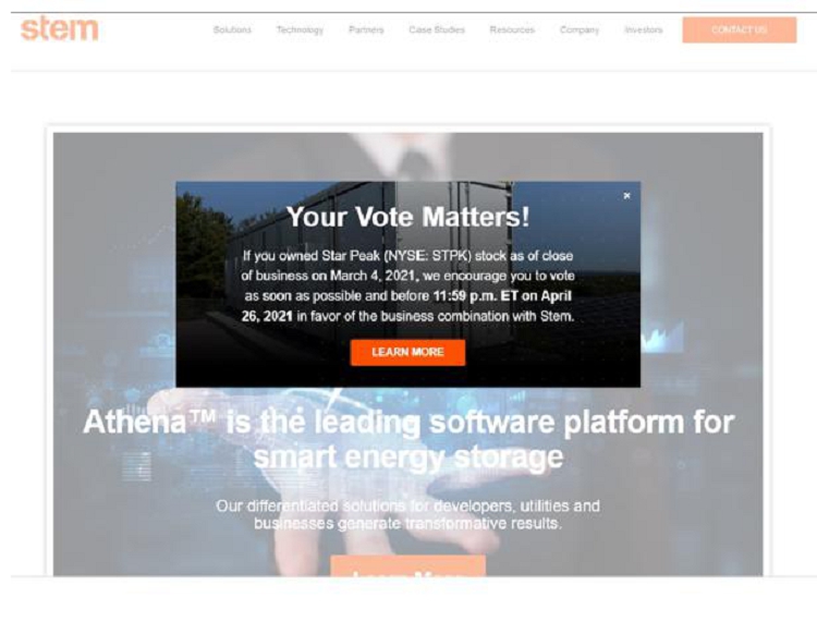| Star Peak Energy Transition Corp. - How to Vote https://starpeakenergy2020spac.s4.q4web.com/....aspx?SectionId=92561b94-66cd-47ab-8b33-367f4cf8dd56&LanguageId=1&ResetDate=1[3/29/2021 11:42:51 AM] Ally BNY Mellon Charles Schwab CITIBANK E*Trade Interactive Brokers Fidelity Firsttrade J.P. Morgan Securities LLC Merrill Morgan Stanley National Financial Services LLC Pershing LLC Robinhood TD Ameritrade TradeStation Vangaurd Brokerage Services Webull Wells Fargo Clearing Services Additional Information This communication is being made in respect of a proposed merger transaction (the “proposed transactions”) involving Star Peak Energy Transition Corp. (“STPK”) and Stem, Inc. (the “Company”). The proposed transactions will be submitted to stockholders of STPK for their |