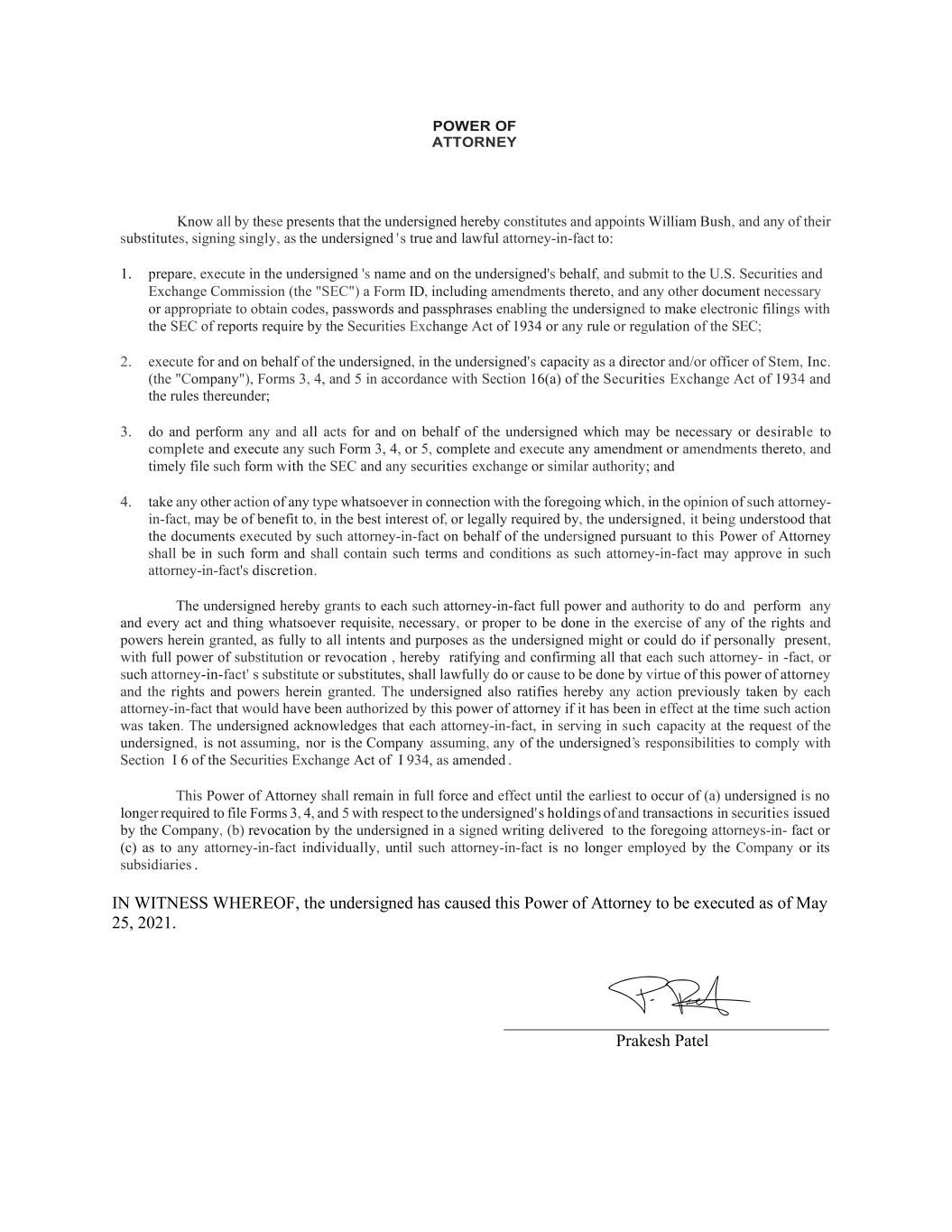 POWER OF ATTORNEY Know all by these presents that the undersigned hereby constitutes and appoints William Bush, and any of their substitutes, signing singly, as the undersigned ' s true and lawful attorney-in-fact to: 1. prepare, execute in the undersigned 's name and on the undersigned's behalf, and submit to the U.S. Securities and Exchange Commission (the "SEC") a Form ID, including amendments thereto, and any other document necessary or appropriate to obtain codes, passwords and passphrases enabling the undersigned to make electronic filings with the SEC of reports require by the Securities Exchange Act of 1934 or any rule or regulation of the SEC; 2. execute for and on behalf of the undersigned, in the undersigned's capacity as a director and/or officer of Stem, Inc. (the "Company"), Forms 3, 4, and 5 in accordance with Section 16(a) of the Securities Exchange Act of 1934 and the rules thereunder; 3. do and perform any and all acts for and on behalf of the undersigned which may be necessary or desirable to complete and execute any such Form 3, 4, or 5, complete and execute any amendment or amendments thereto, and timely file such form with the SEC and any securities exchange or similar authority; and 4. take any other action of any type whatsoever in connection with the foregoing which, in the opinion of such attorney- in-fact, may be of benefit to, in the best interest of, or legally required by, the undersigned, it being understood that the documents executed by such attorney-in-fact on behalf of the undersigned pursuant to this Power of Attorney shall be in such form and shall contain such terms and conditions as such attorney-in-fact may approve in such attorney-in-fact's discretion. The undersigned hereby grants to each such attorney-in-fact full power and authority to do and perform any and every act and thing whatsoever requisite, necessary, or proper to be done in the exercise of any of the rights and powers herein granted, as fully to all intents and purposes as the undersigned might or could do if personally present, with full power of substitution or revocation , hereby ratifying and confirming all that each such attorney- in -fact, or such attorney-in-fact' s substitute or substitutes, shall lawfully do or cause to be done by virtue of this power of attorney and the rights and powers herein granted. The undersigned also ratifies hereby any action previously taken by each attorney-in-fact that would have been authorized by this power of attorney if it has been in effect at the time such action was taken. The undersigned acknowledges that each attorney-in-fact, in serving in such capacity at the request of the undersigned, is not assuming, nor is the Company assuming, any of the undersigned’s responsibilities to comply with Section I 6 of the Securities Exchange Act of I 934, as amended . This Power of Attorney shall remain in full force and effect until the earliest to occur of (a) undersigned is no longer required to file Forms 3, 4, and 5 with respect to the undersigned' s holdings of and transactions in securities issued by the Company, (b) revocation by the undersigned in a signed writing delivered to the foregoing attorneys-in- fact or (c) as to any attorney-in-fact individually, until such attorney-in-fact is no longer employed by the Company or its subsidiaries . IN WITNESS WHEREOF, the undersigned has caused this Power of Attorney to be executed as of May 25, 2021. ______________________________________ Prakesh Patel