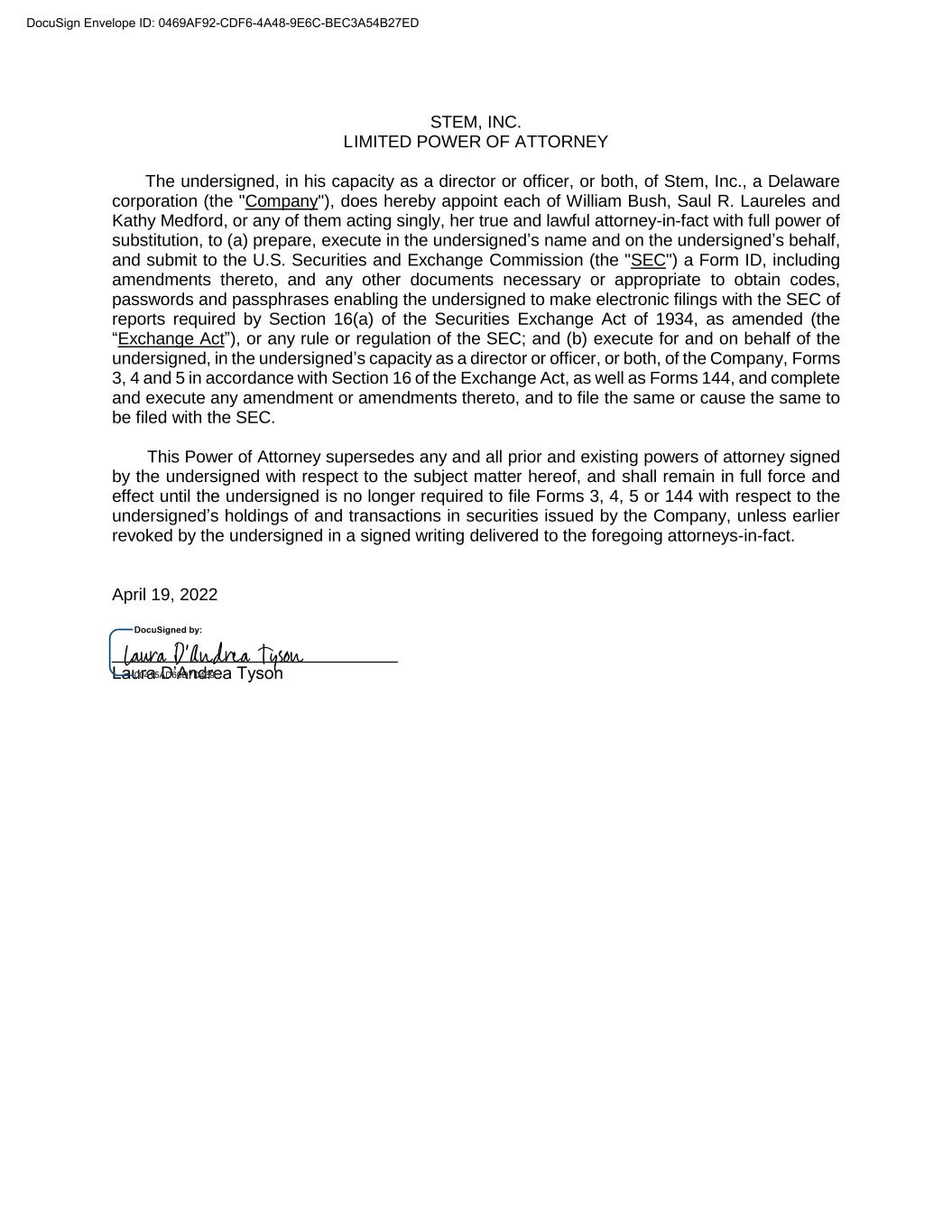STEM, INC. LIMITED POWER OF ATTORNEY The undersigned, in his capacity as a director or officer, or both, of Stem, Inc., a Delaware corporation (the "Company"), does hereby appoint each of William Bush, Saul R. Laureles and Kathy Medford, or any of them acting singly, her true and lawful attorney-in-fact with full power of substitution, to (a) prepare, execute in the undersigned’s name and on the undersigned’s behalf, and submit to the U.S. Securities and Exchange Commission (the "SEC") a Form ID, including amendments thereto, and any other documents necessary or appropriate to obtain codes, passwords and passphrases enabling the undersigned to make electronic filings with the SEC of reports required by Section 16(a) of the Securities Exchange Act of 1934, as amended (the “Exchange Act”), or any rule or regulation of the SEC; and (b) execute for and on behalf of the undersigned, in the undersigned’s capacity as a director or officer, or both, of the Company, Forms 3, 4 and 5 in accordance with Section 16 of the Exchange Act, as well as Forms 144, and complete and execute any amendment or amendments thereto, and to file the same or cause the same to be filed with the SEC. This Power of Attorney supersedes any and all prior and existing powers of attorney signed by the undersigned with respect to the subject matter hereof, and shall remain in full force and effect until the undersigned is no longer required to file Forms 3, 4, 5 or 144 with respect to the undersigned’s holdings of and transactions in securities issued by the Company, unless earlier revoked by the undersigned in a signed writing delivered to the foregoing attorneys-in-fact. April 19, 2022 ______________________________ Laura D’Andrea Tyson DocuSign Envelope ID: 0469AF92-CDF6-4A48-9E6C-BEC3A54B27ED