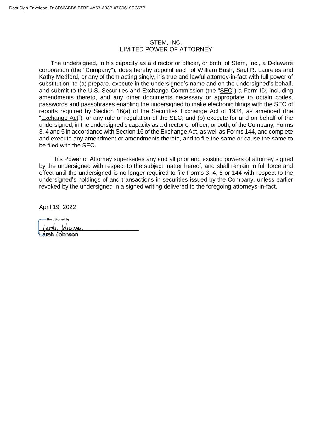 STEM, INC. LIMITED POWER OF ATTORNEY The undersigned, in his capacity as a director or officer, or both, of Stem, Inc., a Delaware corporation (the "Company"), does hereby appoint each of William Bush, Saul R. Laureles and Kathy Medford, or any of them acting singly, his true and lawful attorney-in-fact with full power of substitution, to (a) prepare, execute in the undersigned’s name and on the undersigned’s behalf, and submit to the U.S. Securities and Exchange Commission (the "SEC") a Form ID, including amendments thereto, and any other documents necessary or appropriate to obtain codes, passwords and passphrases enabling the undersigned to make electronic filings with the SEC of reports required by Section 16(a) of the Securities Exchange Act of 1934, as amended (the “Exchange Act”), or any rule or regulation of the SEC; and (b) execute for and on behalf of the undersigned, in the undersigned’s capacity as a director or officer, or both, of the Company, Forms 3, 4 and 5 in accordance with Section 16 of the Exchange Act, as well as Forms 144, and complete and execute any amendment or amendments thereto, and to file the same or cause the same to be filed with the SEC. This Power of Attorney supersedes any and all prior and existing powers of attorney signed by the undersigned with respect to the subject matter hereof, and shall remain in full force and effect until the undersigned is no longer required to file Forms 3, 4, 5 or 144 with respect to the undersigned’s holdings of and transactions in securities issued by the Company, unless earlier revoked by the undersigned in a signed writing delivered to the foregoing attorneys-in-fact. April 19, 2022 ______________________________ Larsh Johnson DocuSign Envelope ID: 8F66ABB8-BFBF-4A63-A33B-07C9619CC67B