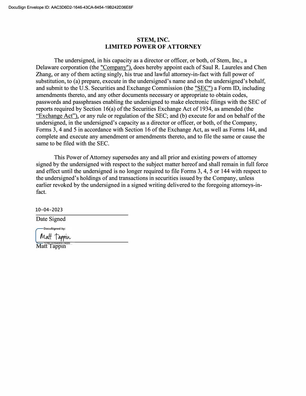 DocuSign Envelope ID: AAC3D6D2-1646-43CA-8454-19B242D36E6F STEM,INC. LIMITED POWER OF ATTORNEY The undersigned, in his capacity as a director or officer, or both, of Stem, Inc., a Delaware corporation (the "Company"), does hereby appoint each of Saul R. Laureles and Chen Zhang, or any of them acting singly, his true and lawful attorney-in-fact with full power of substitution, to (a) prepare, execute in the undersigned's name and on the undersigned's behalf, and submit to the U.S. Securities and Exchange Commission (the "SEC") a Form ID, including amendments thereto, and any other documents necessary or appropriate to obtain codes, passwords and passphrases enabling the undersigned to make electronic filings with the SEC of reports required by Section 16(a) of the Securities Exchange Act of 1934, as amended (the "Exchange Act"), or any rule or regulation of the SEC; and (b) execute for and on behalf of the undersigned, in the undersigned's capacity as a director or officer, or both, of the Company, Forms 3, 4 and 5 in accordance with Section 16 of the Exchange Act, as well as Forms 144, and complete and execute any amendment or amendments thereto, and to file the same or cause the same to be filed with the SEC. This Power of Attorney supersedes any and all prior and existing powers of attorney signed by the undersigned with respect to the subject matter hereof and shall remain in full force and effect until the undersigned is no longer required to file Forms 3, 4, 5 or 144 with respect to the undersigned's holdings of and transactions in securities issued by the Company, unless earlier revoked by the undersigned in a signed writing delivered to the foregoing attorneys-inĀ­ fact. 10-04-2023 Date Signed