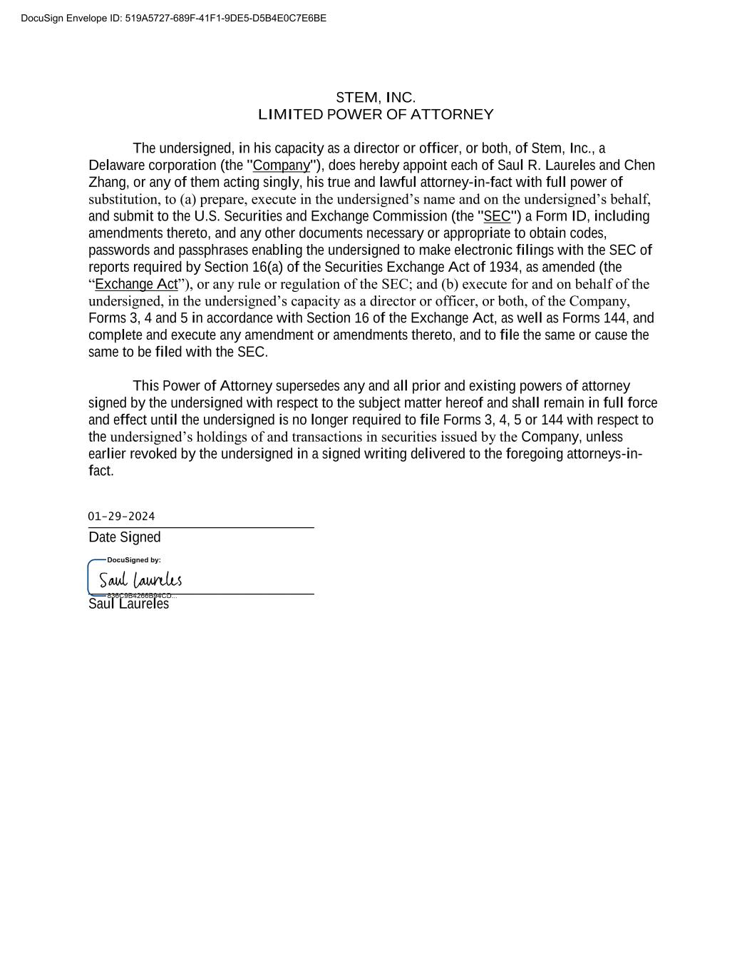 STEM, INC. LIMITED POWER OF ATTORNEY The undersigned, in his capacity as a director or officer, or both, of Stem, Inc., a Delaware corporation (the "Company"), does hereby appoint each of Saul R. Laureles and Chen Zhang, or any of them acting singly, his true and lawful attorney-in-fact with full power of substitution, to (a) prepare, execute in the undersigned’s name and on the undersigned’s behalf, and submit to the U.S. Securities and Exchange Commission (the "SEC") a Form ID, including amendments thereto, and any other documents necessary or appropriate to obtain codes, passwords and passphrases enabling the undersigned to make electronic filings with the SEC of reports required by Section 16(a) of the Securities Exchange Act of 1934, as amended (the “Exchange Act”), or any rule or regulation of the SEC; and (b) execute for and on behalf of the undersigned, in the undersigned’s capacity as a director or officer, or both, of the Company, Forms 3, 4 and 5 in accordance with Section 16 of the Exchange Act, as well as Forms 144, and complete and execute any amendment or amendments thereto, and to file the same or cause the same to be filed with the SEC. This Power of Attorney supersedes any and all prior and existing powers of attorney signed by the undersigned with respect to the subject matter hereof and shall remain in full force and effect until the undersigned is no longer required to file Forms 3, 4, 5 or 144 with respect to the undersigned’s holdings of and transactions in securities issued by the Company, unless earlier revoked by the undersigned in a signed writing delivered to the foregoing attorneys-in- fact. ______________________________ Date Signed ______________________________ Saul Laureles DocuSign Envelope ID: 519A5727-689F-41F1-9DE5-D5B4E0C7E6BE 01-29-2024