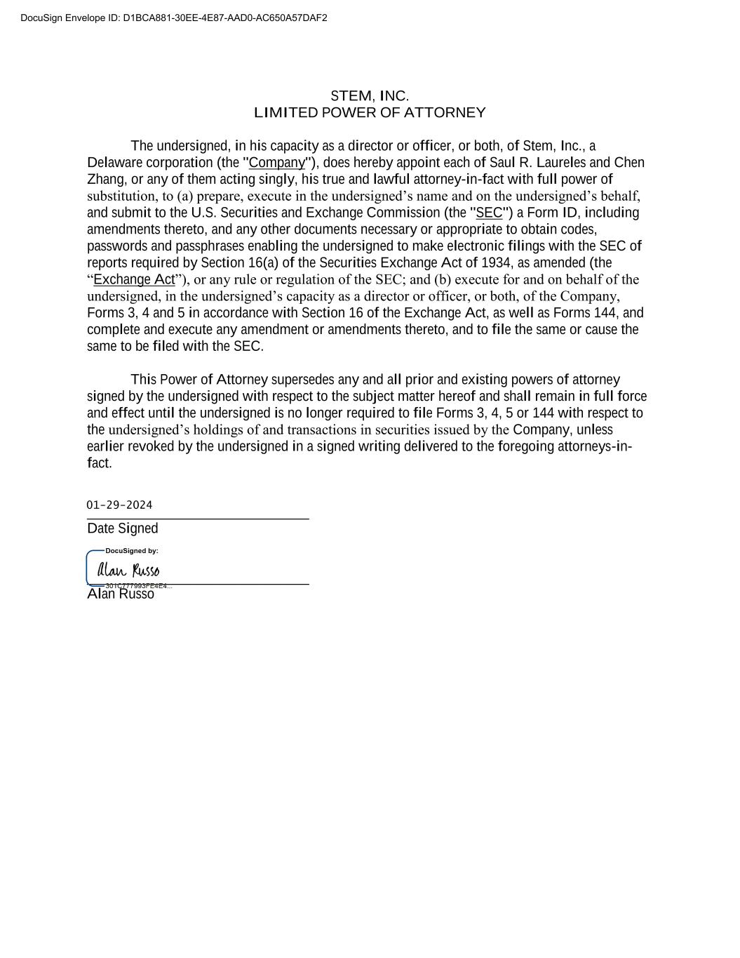 STEM, INC. LIMITED POWER OF ATTORNEY The undersigned, in his capacity as a director or officer, or both, of Stem, Inc., a Delaware corporation (the "Company"), does hereby appoint each of Saul R. Laureles and Chen Zhang, or any of them acting singly, his true and lawful attorney-in-fact with full power of substitution, to (a) prepare, execute in the undersigned’s name and on the undersigned’s behalf, and submit to the U.S. Securities and Exchange Commission (the "SEC") a Form ID, including amendments thereto, and any other documents necessary or appropriate to obtain codes, passwords and passphrases enabling the undersigned to make electronic filings with the SEC of reports required by Section 16(a) of the Securities Exchange Act of 1934, as amended (the “Exchange Act”), or any rule or regulation of the SEC; and (b) execute for and on behalf of the undersigned, in the undersigned’s capacity as a director or officer, or both, of the Company, Forms 3, 4 and 5 in accordance with Section 16 of the Exchange Act, as well as Forms 144, and complete and execute any amendment or amendments thereto, and to file the same or cause the same to be filed with the SEC. This Power of Attorney supersedes any and all prior and existing powers of attorney signed by the undersigned with respect to the subject matter hereof and shall remain in full force and effect until the undersigned is no longer required to file Forms 3, 4, 5 or 144 with respect to the undersigned’s holdings of and transactions in securities issued by the Company, unless earlier revoked by the undersigned in a signed writing delivered to the foregoing attorneys-in- fact. ______________________________ Date Signed ______________________________ Alan Russo DocuSign Envelope ID: D1BCA881-30EE-4E87-AAD0-AC650A57DAF2 01-29-2024