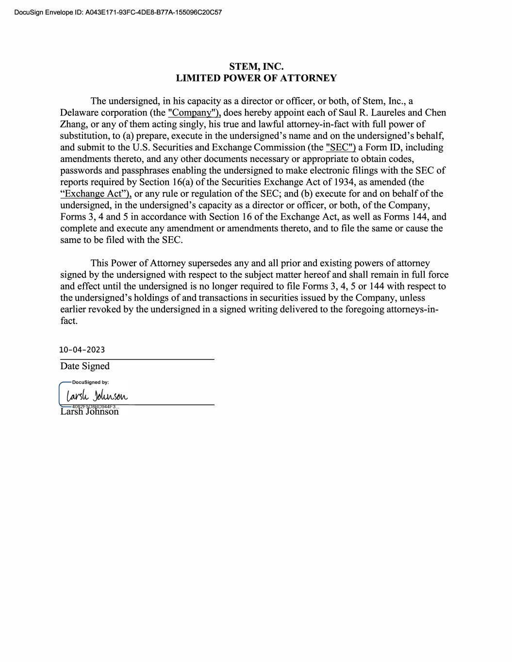 DocuSign Envelope ID: A043E171-93FC-4DE8-B77A-155096C20C57 STEM,INC. LIMITED POWER OF ATTORNEY The undersigned, in his capacity as a director or officer, or both, of Stem, Inc., a Delaware corporation (the "Company"), does hereby appoint each of Saul R. Laureles and Chen Zhang, or any of them acting singly, his true and lawful attorney-in-fact with full power of substitution, to (a) prepare, execute in the undersigned's name and on the undersigned's behalf, and submit to the U.S. Securities and Exchange Commission (the "SEC") a Form ID, including amendments thereto, and any other documents necessary or appropriate to obtain codes, passwords and passphrases enabling the undersigned to make electronic filings with the SEC of reports required by Section 16(a) of the Securities Exchange Act of 1934, as amended (the "Exchange Act"), or any rule or regulation of the SEC; and (b) execute for and on behalf of the undersigned, in the undersigned's capacity as a director or officer, or both, of the Company, Forms 3, 4 and 5 in accordance with Section 16 of the Exchange Act, as well as Forms 144, and complete and execute any amendment or amendments thereto, and to file the same or cause the same to be filed with the SEC. This Power of Attorney supersedes any and all prior and existing powers of attorney signed by the undersigned with respect to the subject matter hereof and shall remain in full force and effect until the undersigned is no longer required to file Forms 3, 4, 5 or 144 with respect to the undersigned's holdings of and transactions in securities issued by the Company, unless earlier revoked by the undersigned in a signed writing delivered to the foregoing attorneys-inĀ­ fact. 10-04-2023 Date Signed