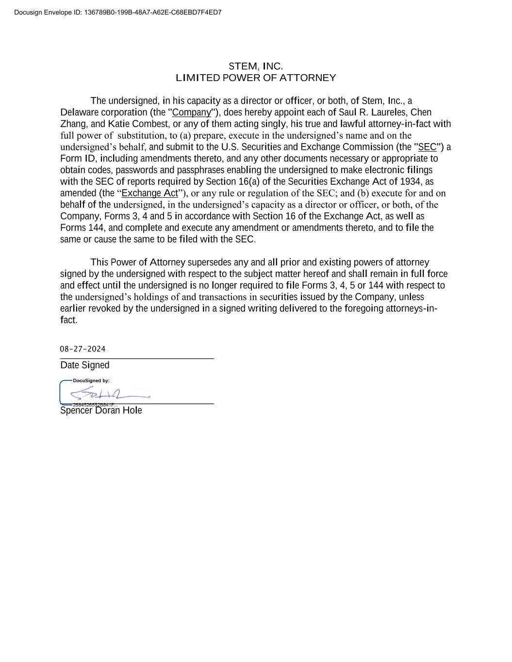 STEM, INC. LIMITED POWER OF ATTORNEY The undersigned, in his capacity as a director or officer, or both, of Stem, Inc., a Delaware corporation (the "Company"), does hereby appoint each of Saul R. Laureles, Chen Zhang, and Katie Combest, or any of them acting singly, his true and lawful attorney-in-fact with full power of substitution, to (a) prepare, execute in the undersigned’s name and on the undersigned’s behalf, and submit to the U.S. Securities and Exchange Commission (the "SEC") a Form ID, including amendments thereto, and any other documents necessary or appropriate to obtain codes, passwords and passphrases enabling the undersigned to make electronic filings with the SEC of reports required by Section 16(a) of the Securities Exchange Act of 1934, as amended (the “Exchange Act”), or any rule or regulation of the SEC; and (b) execute for and on behalf of the undersigned, in the undersigned’s capacity as a director or officer, or both, of the Company, Forms 3, 4 and 5 in accordance with Section 16 of the Exchange Act, as well as Forms 144, and complete and execute any amendment or amendments thereto, and to file the same or cause the same to be filed with the SEC. This Power of Attorney supersedes any and all prior and existing powers of attorney signed by the undersigned with respect to the subject matter hereof and shall remain in full force and effect until the undersigned is no longer required to file Forms 3, 4, 5 or 144 with respect to the undersigned’s holdings of and transactions in securities issued by the Company, unless earlier revoked by the undersigned in a signed writing delivered to the foregoing attorneys-in- fact. ______________________________ Date Signed ______________________________ Spencer Doran Hole Docusign Envelope ID: 136789B0-199B-48A7-A62E-C68EBD7F4ED7 08-27-2024