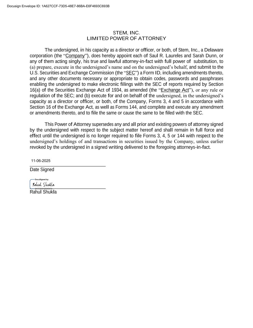STEM, INC. LIMITED POWER OF ATTORNEY The undersigned, in his capacity as a director or officer, or both, of Stem, Inc., a Delaware corporation (the “Company”), does hereby appoint each of Saul R. Laureles and Sarah Dunn, or any of them acting singly, his true and lawful attorney-in-fact with full power of substitution, to (a) prepare, execute in the undersigned’s name and on the undersigned’s behalf, and submit to the U.S. Securities and Exchange Commission (the “SEC”) a Form ID, including amendments thereto, and any other documents necessary or appropriate to obtain codes, passwords and passphrases enabling the undersigned to make electronic filings with the SEC of reports required by Section 16(a) of the Securities Exchange Act of 1934, as amended (the “Exchange Act”), or any rule or regulation of the SEC; and (b) execute for and on behalf of the undersigned, in the undersigned’s capacity as a director or officer, or both, of the Company, Forms 3, 4 and 5 in accordance with Section 16 of the Exchange Act, as well as Forms 144, and complete and execute any amendment or amendments thereto, and to file the same or cause the same to be filed with the SEC. This Power of Attorney supersedes any and all prior and existing powers of attorney signed by the undersigned with respect to the subject matter hereof and shall remain in full force and effect until the undersigned is no longer required to file Forms 3, 4, 5 or 144 with respect to the undersigned’s holdings of and transactions in securities issued by the Company, unless earlier revoked by the undersigned in a signed writing delivered to the foregoing attorneys-in-fact. ______________________________ Date Signed ______________________________ Rahul Shukla Docusign Envelope ID: 1A627CCF-73D5-48E7-86BA-E6F4693C693B 11-06-2025